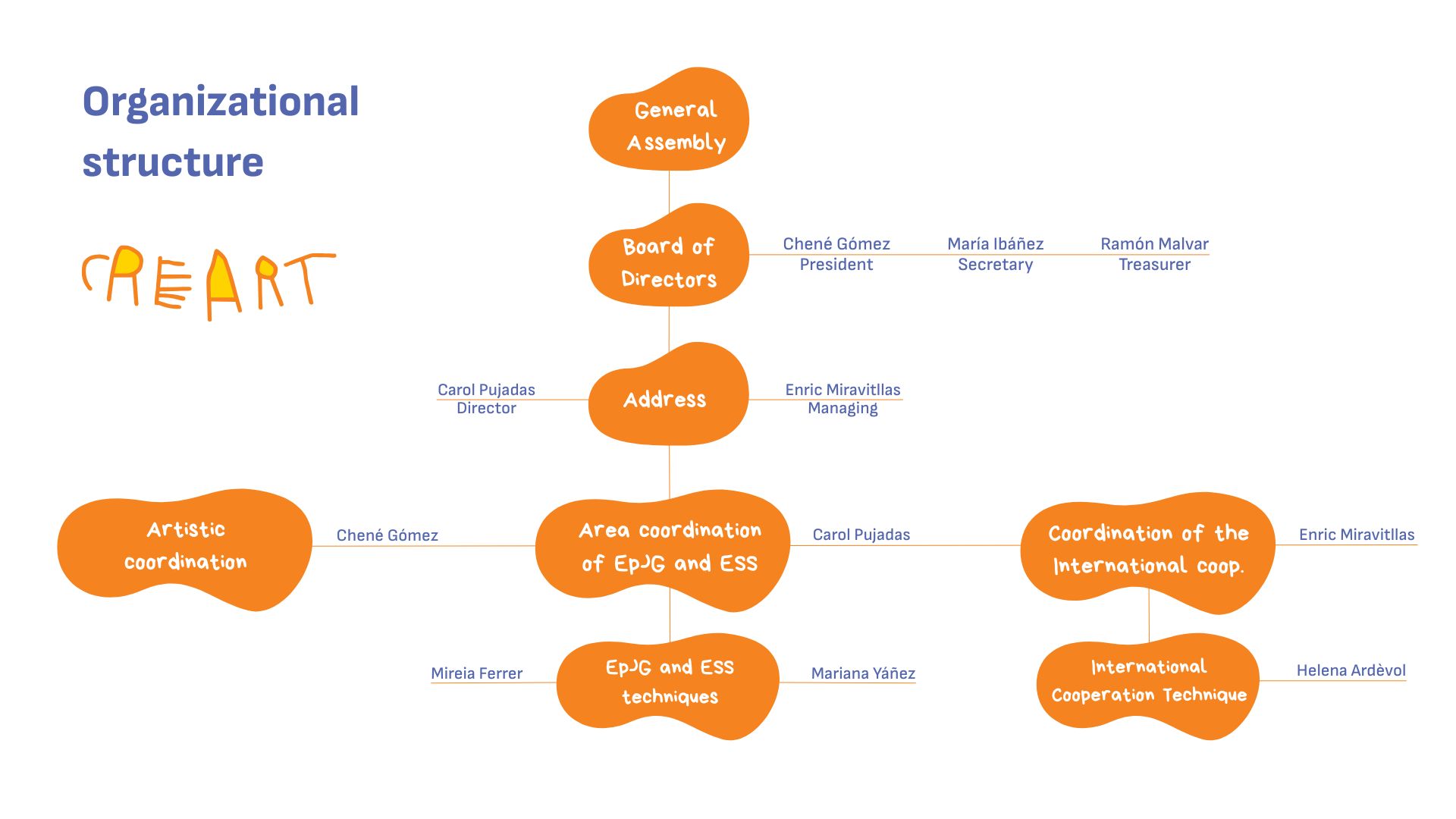 For decision-making: Creart is structured around the technical operating team and a board of directors, a body that is subject to the vote of the members through the general assemblies where the annual budgets and balance sheet are presented and the strategic lines of the organisation in the different sectors of intervention are decided.